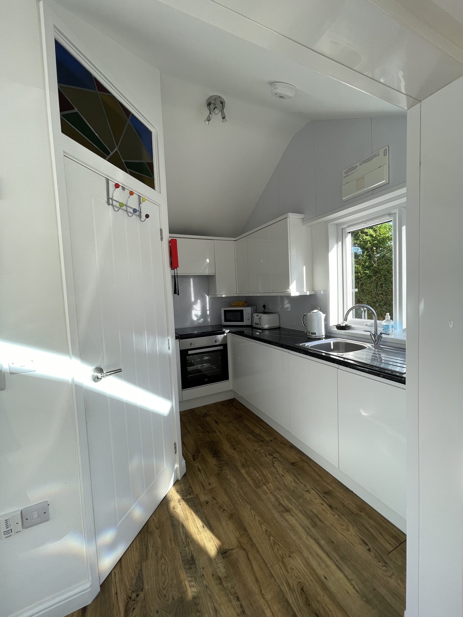 • Built-in electric oven and hob provide the main cooking facilities. • Standard full-size fridge with small freezer compartment. • Microwave oven . • Toaster. • Electric kettle. • Cookware, utensils, and chopping boards. • Crockery, including plates, bowls, mugs, drinking glasses. Highlights