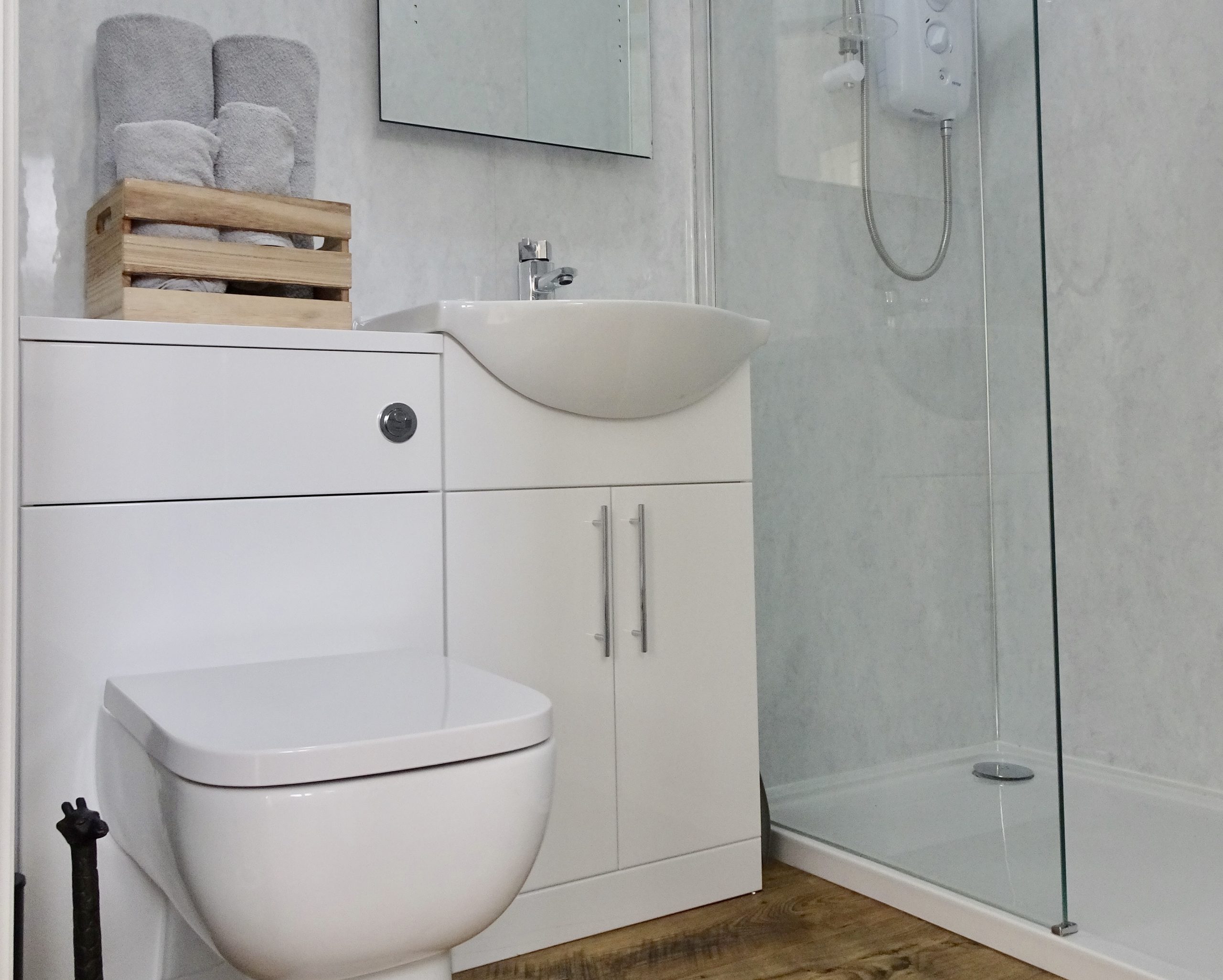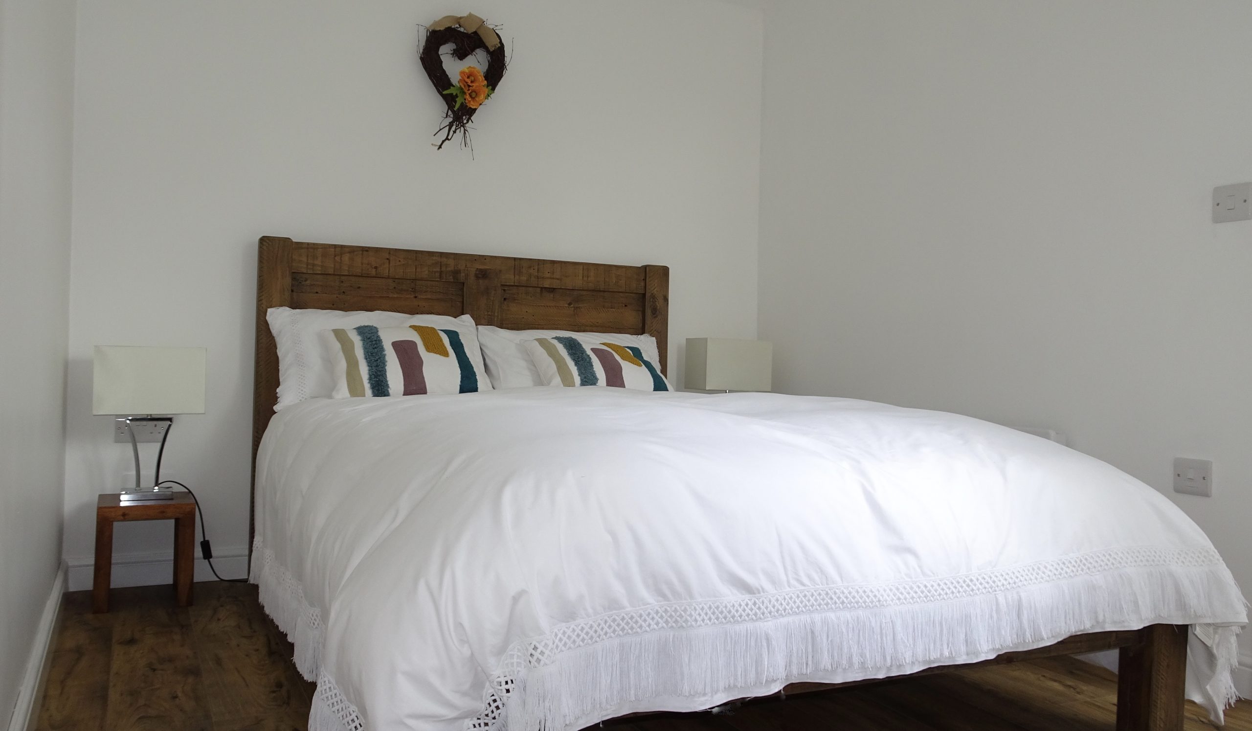 Comfortable double bed, side tables and lamps, electric wall heater, storage recess with hanging rail and under-shelf storage, USB sockets, mirror, hair dryer.