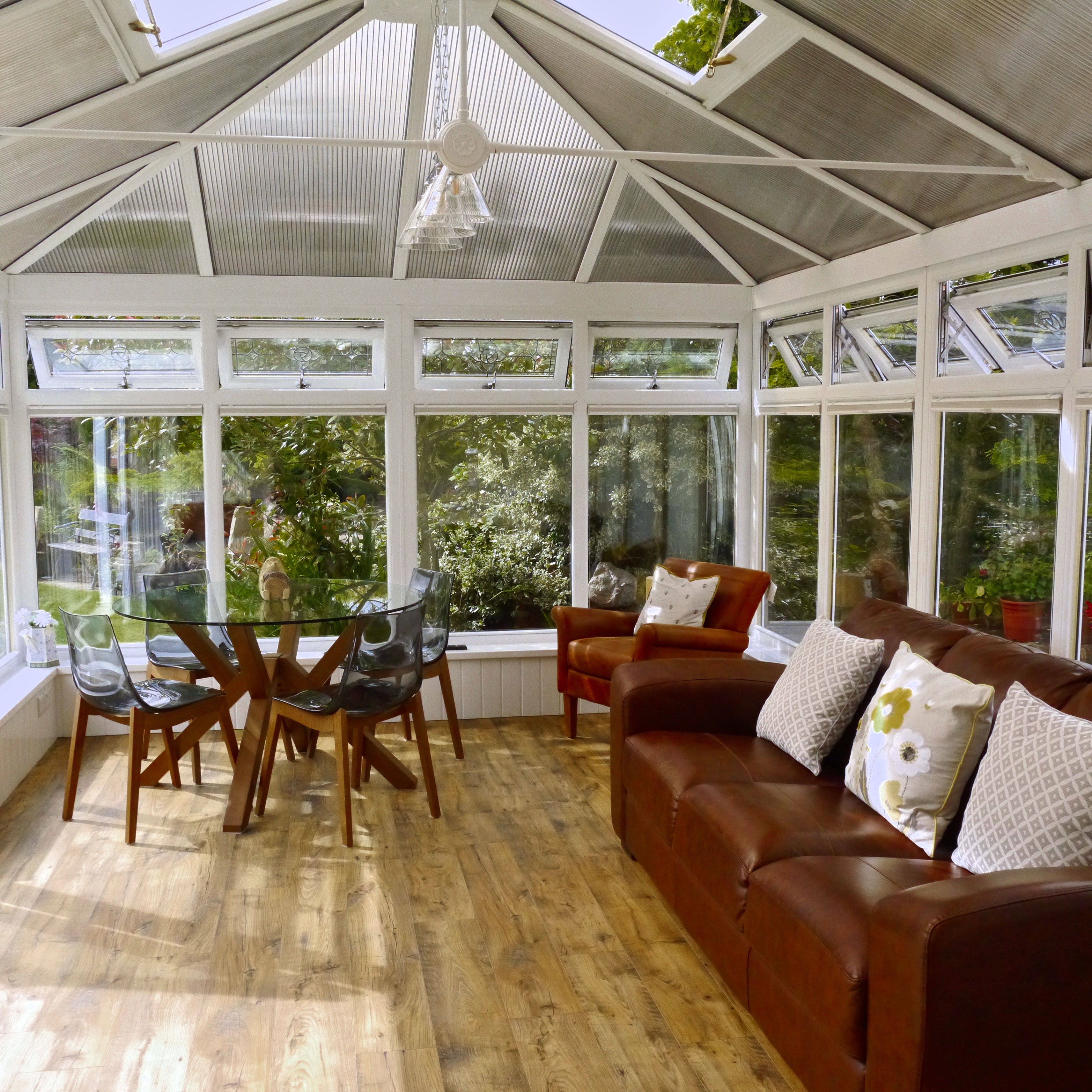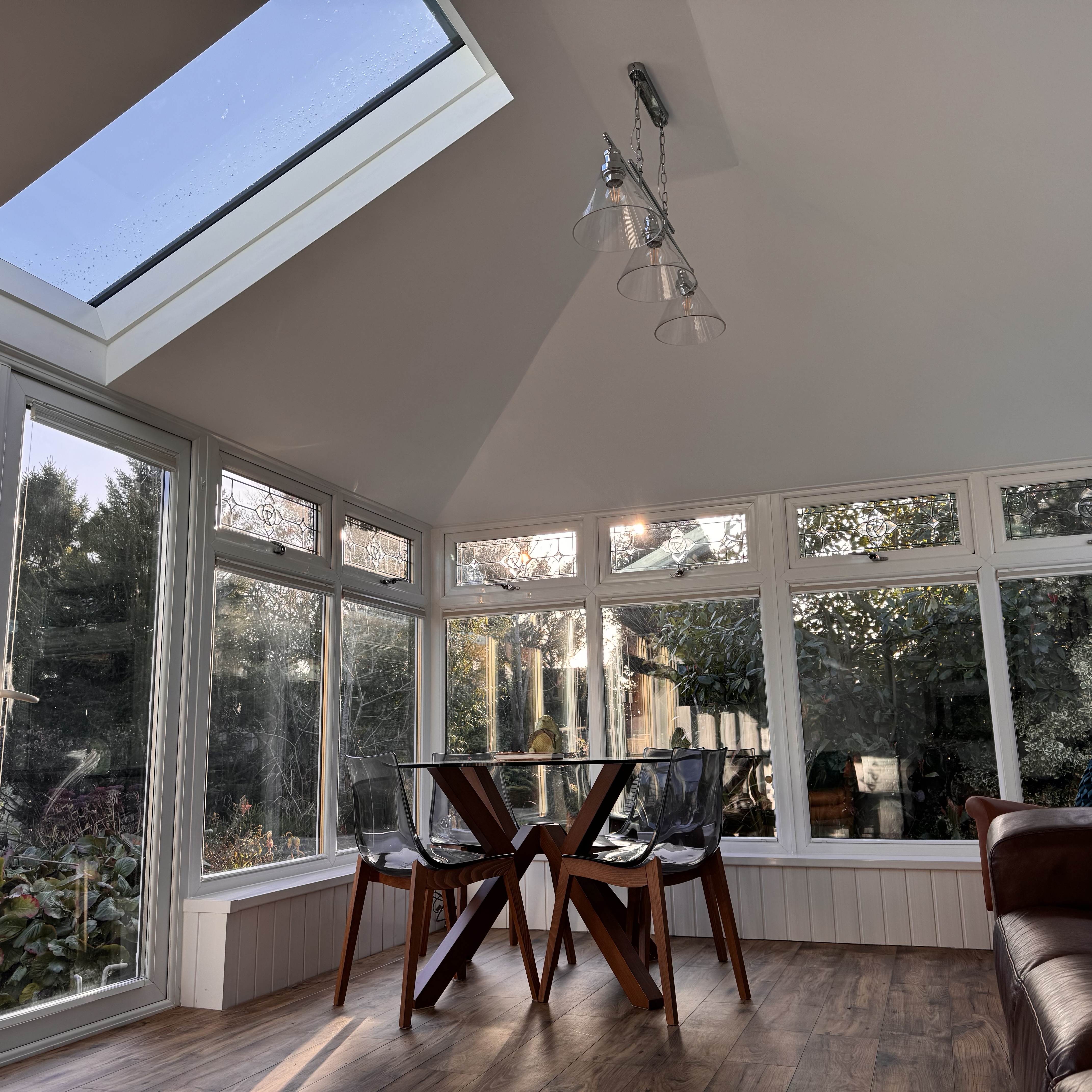 These 2 photos highlight the recent upgrade to Gardenside Lodge's living/dining area, featuring a brand-new warm roof.
